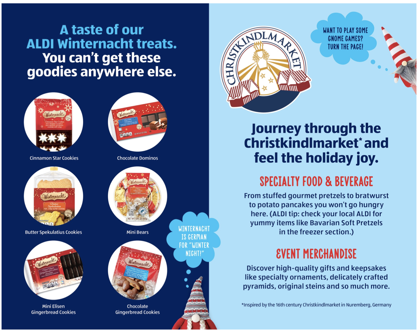 Leading a small but mighty team I worked to pull down the National ALDI campaign for local markets around the country. Like the Christkindlmarket in Chicago which ALDI sponsored. So grab a guide to see the journey we took market-goers to discover ALDI Winternacht treats with a little help from the holiday campaign gnomes.